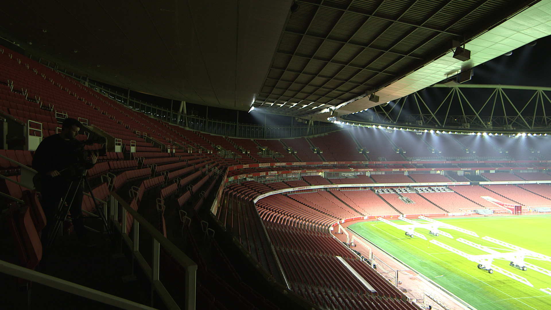 An iPhone camera or even a DSLR would not have been able to capture the range of light and shadows needed when the huge, stadium-wide lights illuminated the Emirates stadium in the dead of night. For this reason, we hired two cinema cameras, specifically designed to capture a great image under huge lights and render colours and shapes perfectly. After meeting some of the team at Arsenal and the lighting technicians through Musco we were lead out to the stadium and had access to wherever we needed to go. We started pitch side and captured the light show on the field and then moved further up in the seating areas to get the grand shot of the entire stadium.